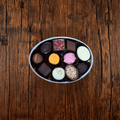 Van RoyDiscover a delightful selection from Van Roy, the Belgian chocolate maestro. This Oval Truffle Box features 11 delicious truffles bursting with flavours from zesty to indulgent, smooth to crunchy. Enjoy treats like marzipan, lemon cheesecake, Irish cream ganache, cherry cream, spiced biscuit praline, salted caramel, lemon ganache, dulce de leche, apricot ganache, orange mousse, and coffee praline.