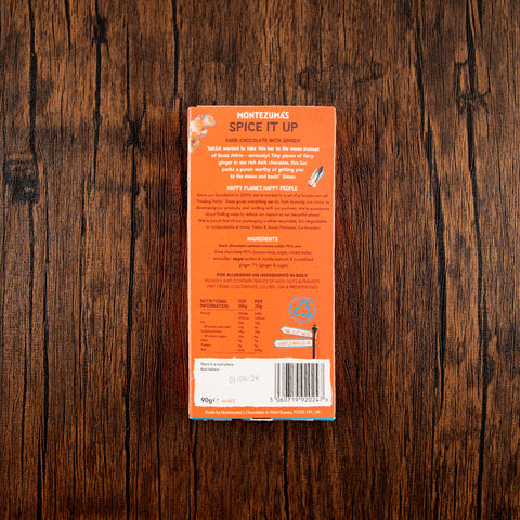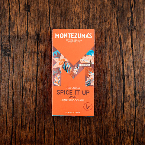 MontezumaMontezuma's Spice it Up bar delivers a daring twist to dark chocolate, infused with vibrant notes of ginger and chilli. Each bite offers a bold splash of warmth that complements the deep, rich cocoa. This bar is perfect for those who appreciate a spirited kick in their chocolate indulgence. Enjoy a unique taste experience crafted for the adventurous palate.